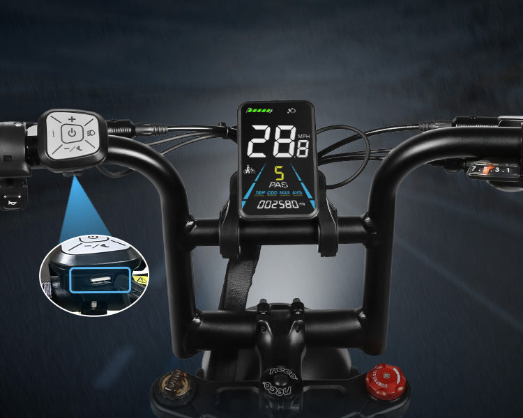 A functional computer/ instrument shows the riding information (including speed, miles, battery, gears,) and bike status (such as brake/ walk-mode/ headlight,) on the 3.5" colored LCD screen. The 5V 1A USB-A port integrated into the keyboard can charge your phone when the display is on. And the new display supports a login password, you can still ride the bike even if the key was lost.
