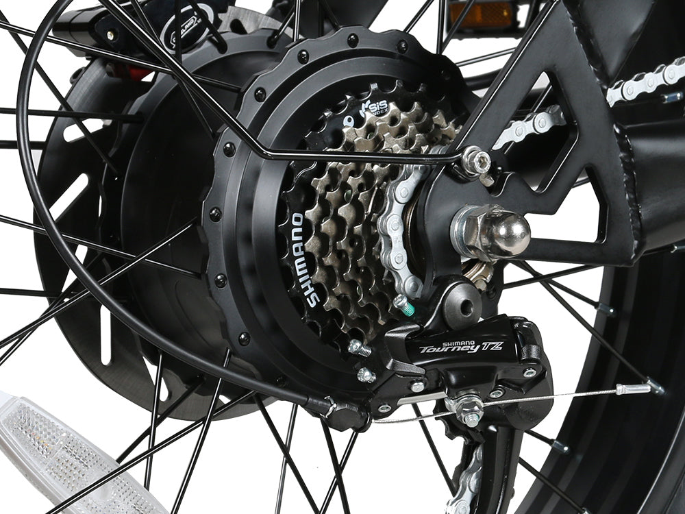 The Shimano chain shifter can smoothly switch between 14-28T 7-speed gears at any time. Allowing pedal-assist models uses in any terrain or even climbing steep slopes doesn`t need motor assistance.