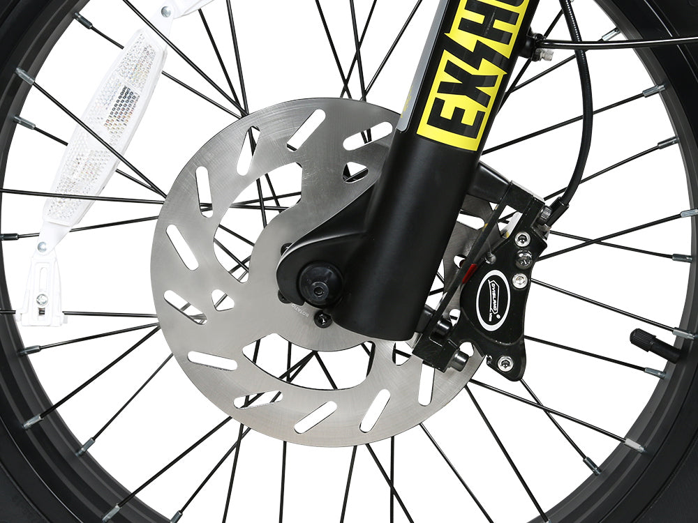 Using hydraulic disc brakes with front and rear 180mm motorcycle rotors, Samebike Pilot adopted customized semi-metal brake pads that provide strong braking force and can quickly stop under a load of 330 pounds to respond to emergency situations