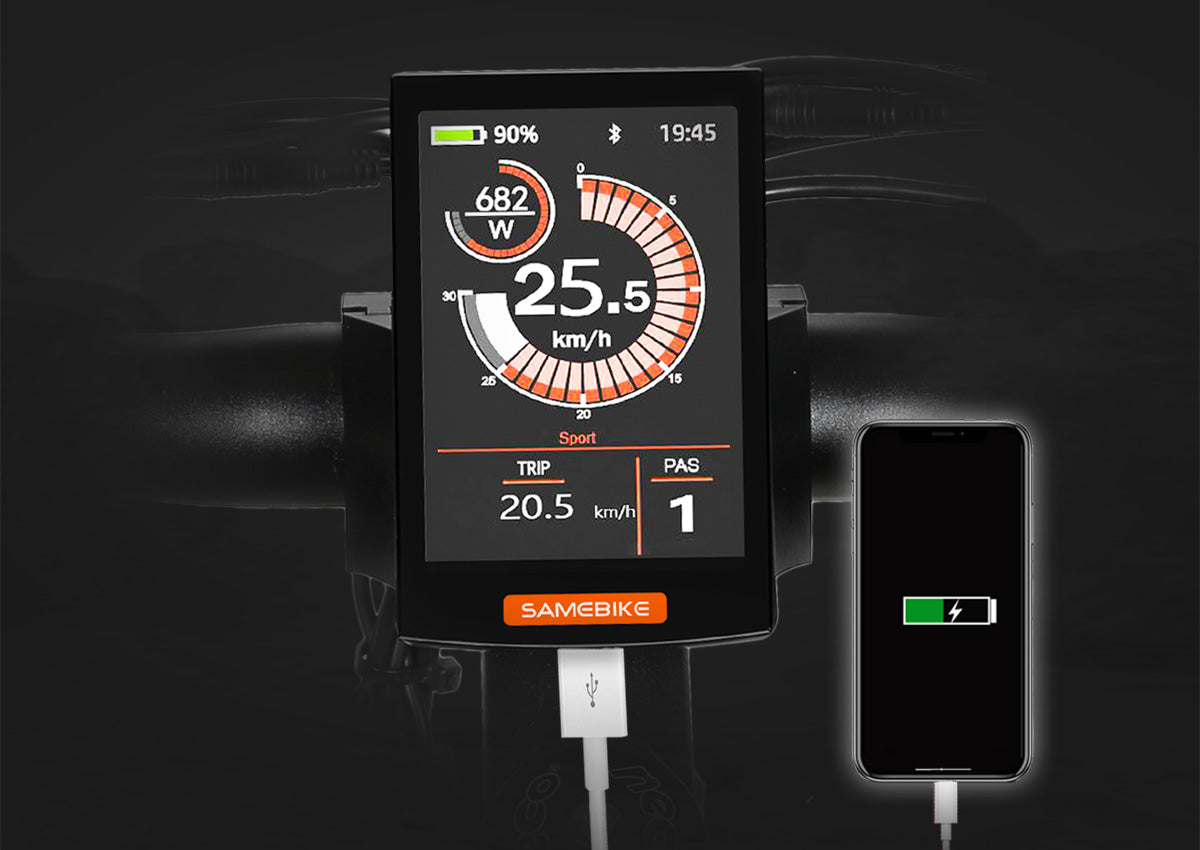 The Samebike RS-A08’s intelligent KD718 color display offers clear visibility in any weather. The display panel was easy to read in bright and dark conditions, and the buttons are intuitive to operate. There is also a USB-A port under the display which is convenient to charge your phone.